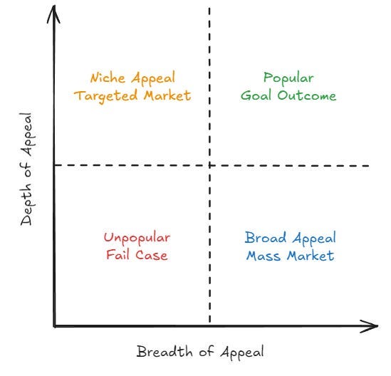 With this perspective we can frame the product evaluation in a new way that allows for multiple kinds of products and unique definitions of success that prevent conflating Niche with Unpopular and Broad with Popular.