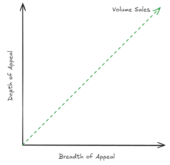 Breadth refers to the 'width' of a product’s appeal, capturing how many people might be interested, regardless of ongoing engagement. Depth measures the 'intensity' of appeal, indicating repeated engagement from the product audience. Together, they form a two-dimensional approach that provides a fuller picture of a product’s potential, revealing distinct paths to success beyond the binary labels of 'popular' or 'unpopular'